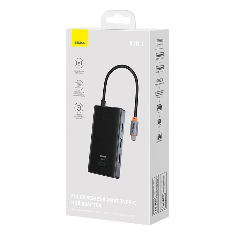 The BASEUS WKYY030313 USB-C Hub is a versatile 8-port solution: 2 USB 3.0 ports for fast transfers, 1 USB 2.0 port, 1 PD charging port, HDMI output for video, SD and TF card slots for memory cards, and an RJ-45 port for a stable network connection. Ideal for maximizing the connectivity of modern devices