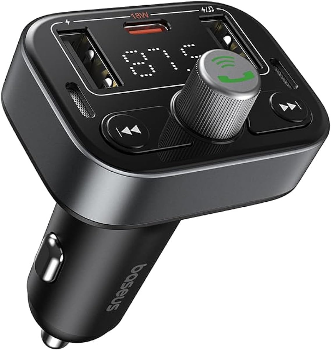 Baseus S-09 Pro Series Car FM Transmitter & Car Charger – 18W PD Fast Charging, HiFi Bass, Noise-Cancelling Mic, Hands-Free, USB Drive Support – Black