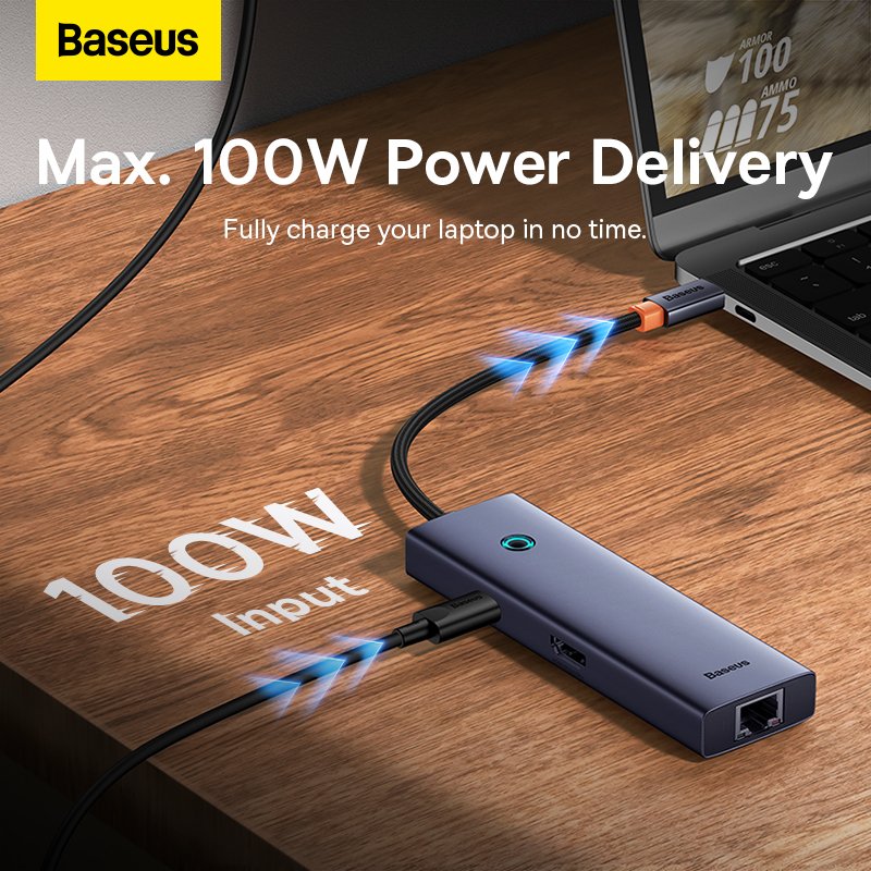 Make your daily work in front of your computer easier. The 6-in-1 Baseus UltraJoy hub features 3 USB 3.0 ports that allow data transfer speeds of up to 5 Gbps. It also has an HDMI port, which supports 4K@30Hz resolution, and an RJ45 jack for lightning-fast connection speeds of up to 1,000 Mbps. You’ll also use it to charge your laptop or smartphone thanks to its fast PD 100W charging. It works with a wide variety of devices, and its compact design means you can always have it at your fingertips.
