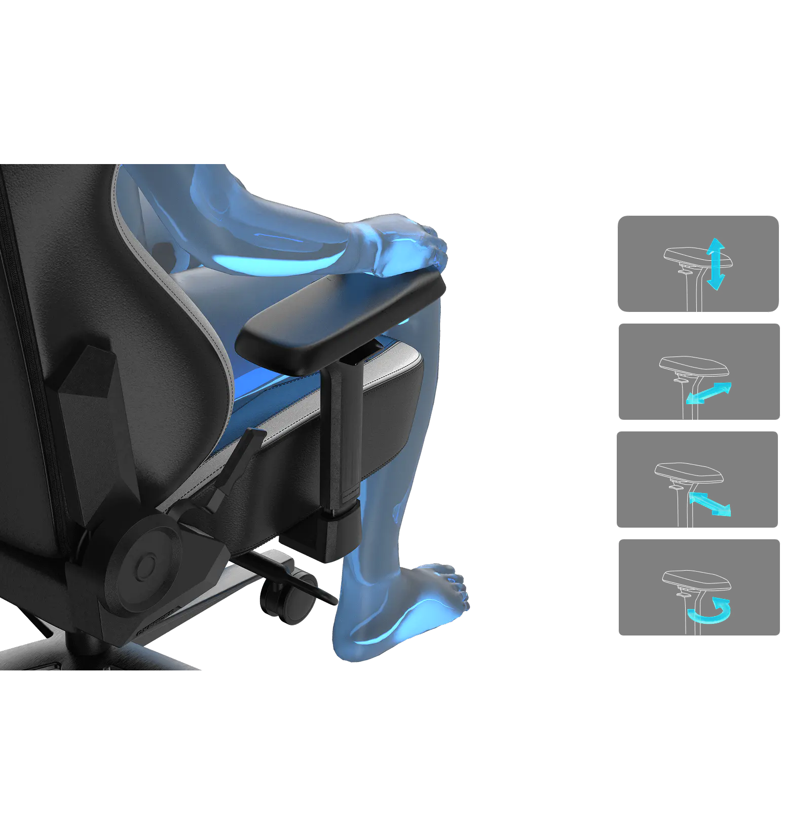 Height (2.87’’), depth (1.42’’), width (0.94’’), and rotation (50°) can be adjusted to perfectly fit your needs. Our armrests with an anti-slip PU foam surface have been tested for 60,000 cycles by SGS to guarantee stability. They can support up to 15 kg and alleviate 48% of elbow pressure.