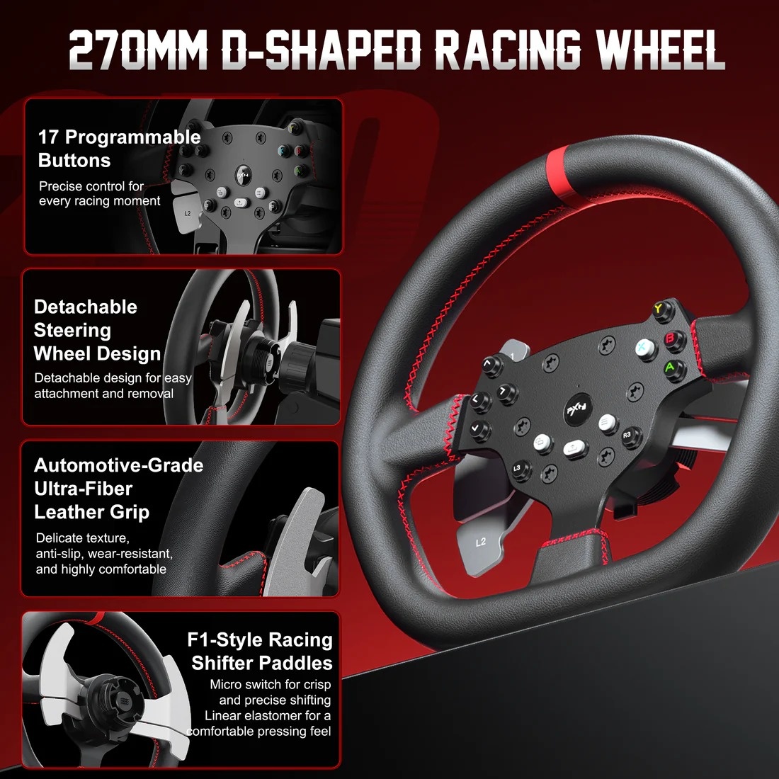 • Detachable Wheel Rim: Features a 270mm steering wheel wrapped in microfiber leather and includes four paddle shifters