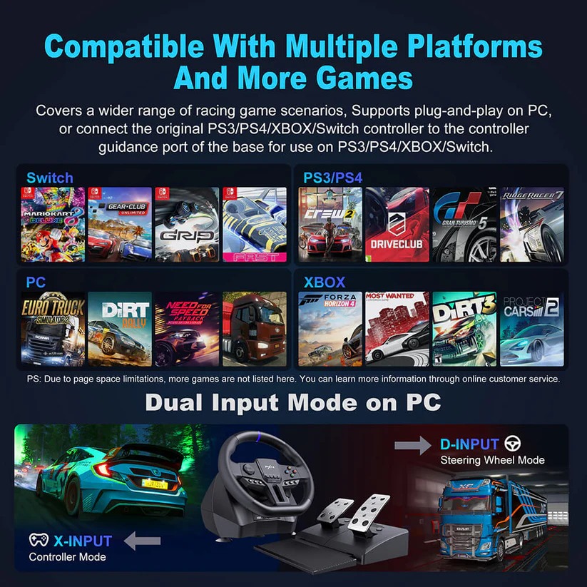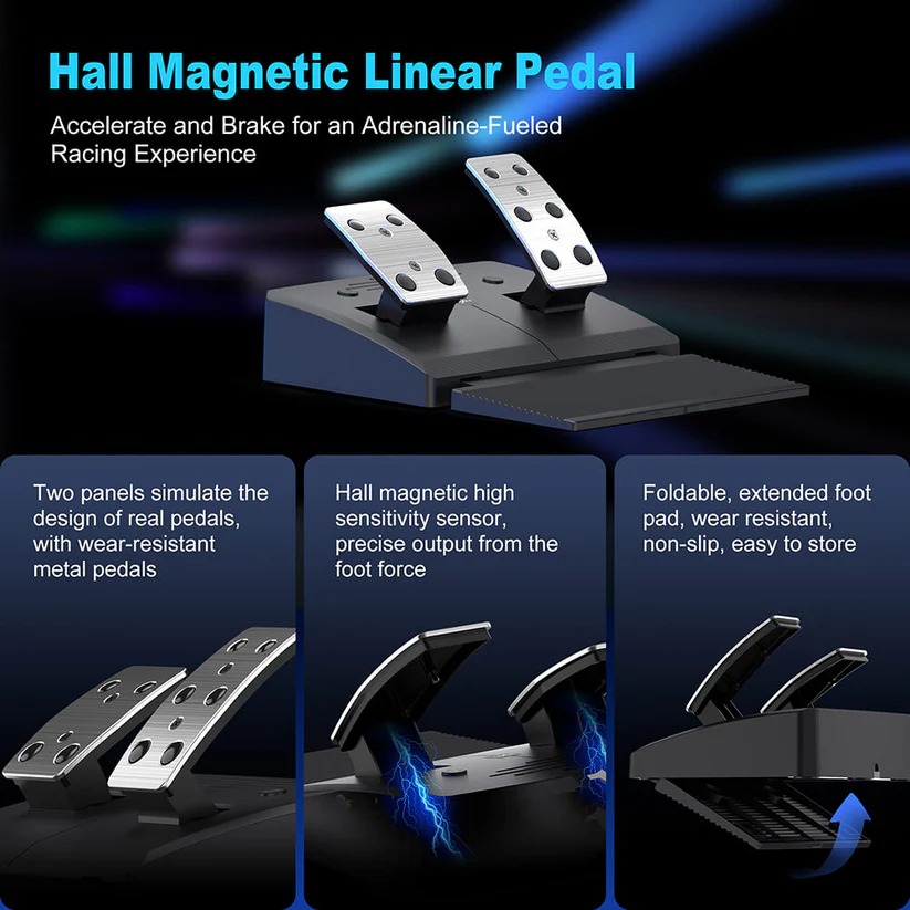 Equipped with a hall-effect pedal set and responsive pedals, the bundle is fully compatible with PC, PlayStation 4, Xbox One/Series X|S, and Nintendo Switch. Plug‑and‑play design with app support makes setup easier than most budget wheels.
