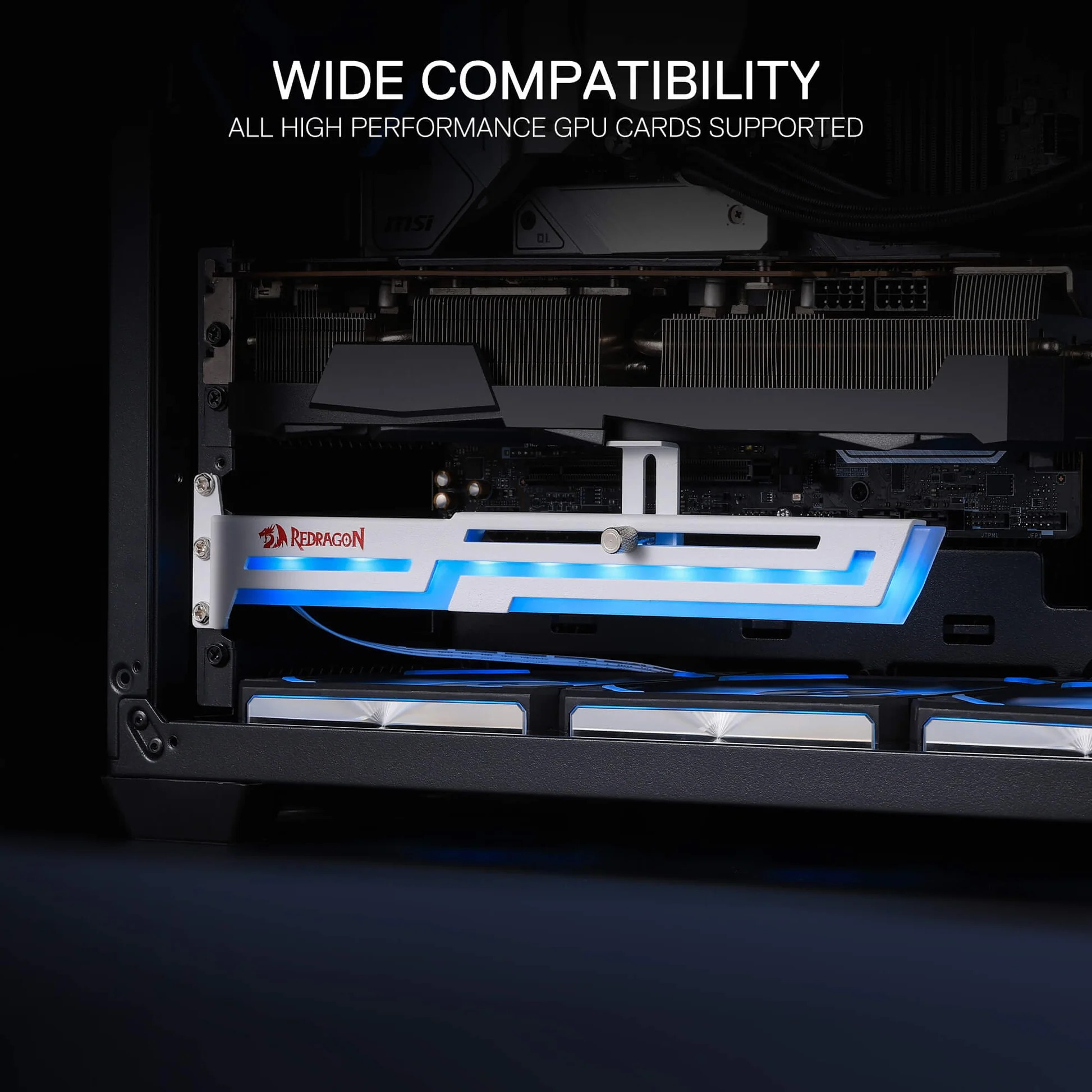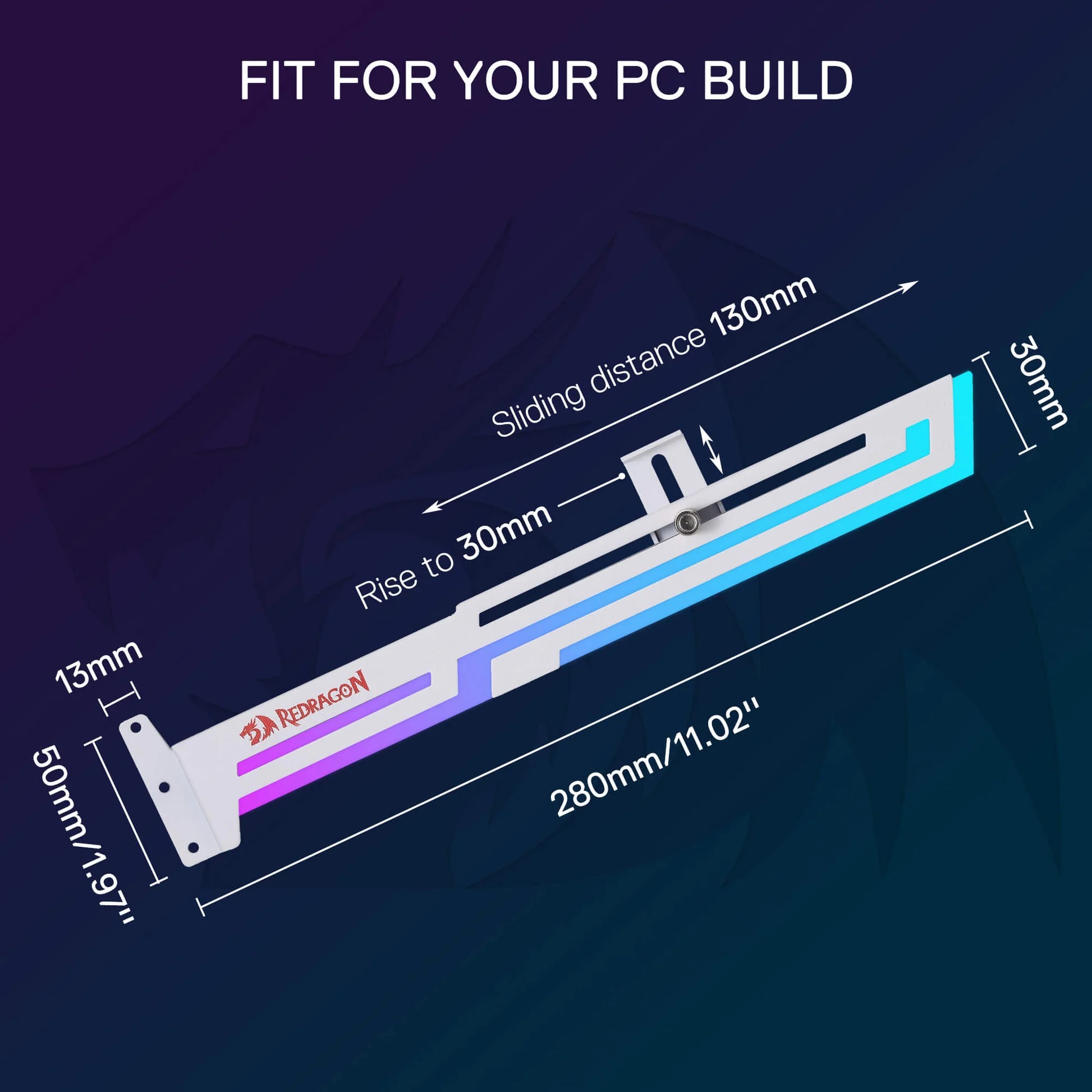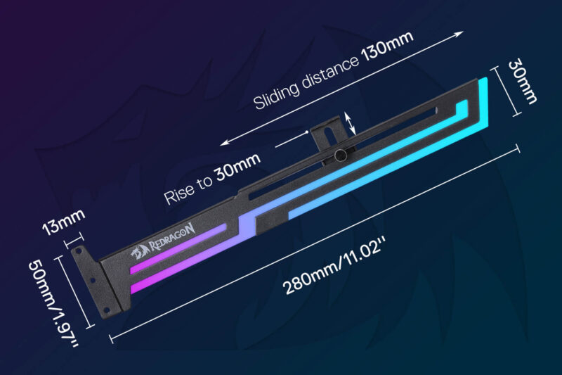 The Redragon GCP03 GPU holder features a sliding support structure that accommodates different lengths of graphics cards and support positions. Before purchasing, please ensure that your PC case has enough space and reserved PCI slots to install the GPU bracket, which has a mounting height of 50mm.