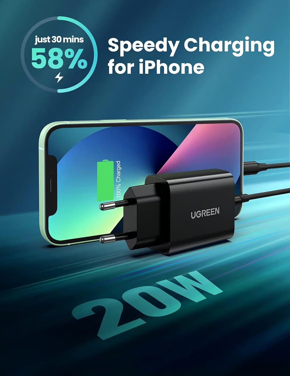 The UGREEN 10191 20W USB C PD 3.0 Charger (Model CD137) offers a powerful, efficient, and compact charging solution for your devices. Designed with compatibility and safety in mind, this USB-C charger supports 20W fast charging, enabling you to charge your iPhone 14 from 0% to 60% in just 30 minutes. Whether you’re on the go or at home, this charger ensures your devices are powered up quickly and safely.