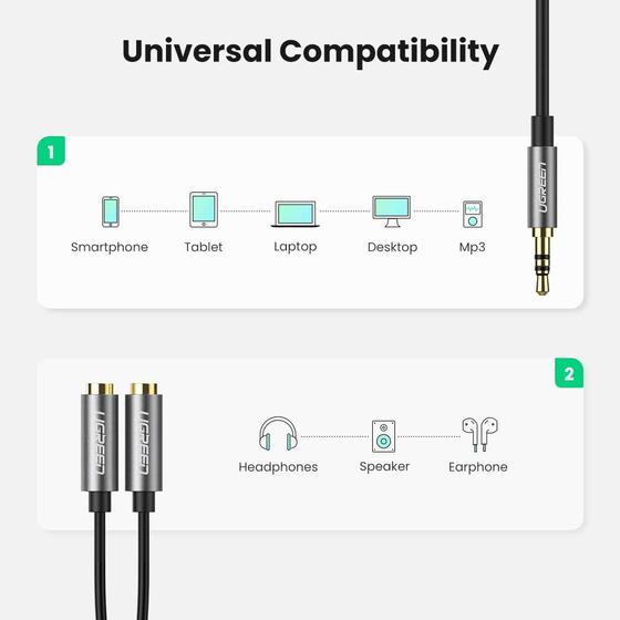 Discover the world of synchronized listening with the UGREEN 10532 3.5mm Aux Stereo Audio Splitter Cable. Share the sound, double the fun.