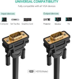 The UGREEN VGA SVGA HD15 Male to Male Video Cable is your ultimate solution for connecting VGA-enabled devices like projectors, HDTVs, displays, and monitors to laptops or PCs. This premium VGA cable supports resolutions up to 1080P Full HD, delivering crisp and clear visuals whether you’re streaming videos, presenting in a meeting, or gaming. Featuring 24k gold-plated connectors and 28 AWG pure copper conductors, this cable ensures smooth and uninterrupted signal transfer, free from lag or interference.