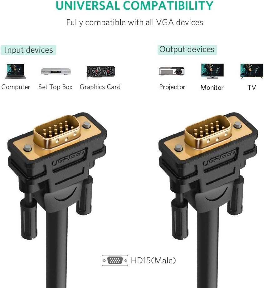 Its triple shielding design, combined with built-in ferrite cores, protects the signal from electromagnetic and radio frequency interference (EMI/RFI), ensuring a stable and high-quality transmission even in demanding environments. The molded strain relief connectors and PVC outer jacket provide extra durability, making this cable both long-lasting and reliable. Whether you’re looking to duplicate your display for presentations or extend your screen for multitasking, the UGREEN VGA cable offers excellent compatibility with a wide range of devices, supporting common VGA resolutions such as 1920×1200 (WUXGA), 1080P (Full HD), 1600×1200 (UXGA), and more.