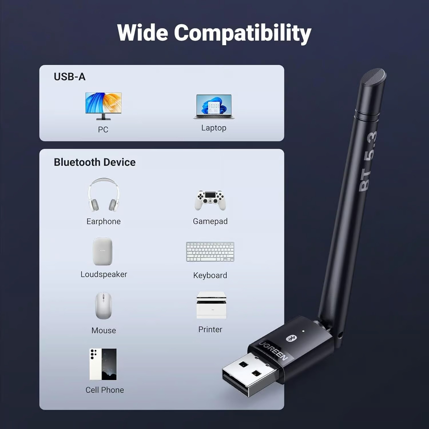 UGREEN 15610 Long Range Bluetooth 5.3 Adapter for PC, USB Bluetooth Dongle, Wireless Bluetooth Transmitter Receiver for Bluetooth Mouse Keyboard Headphones Speakers for Win11/10/8.1 (Plug & Play) Model CM656
