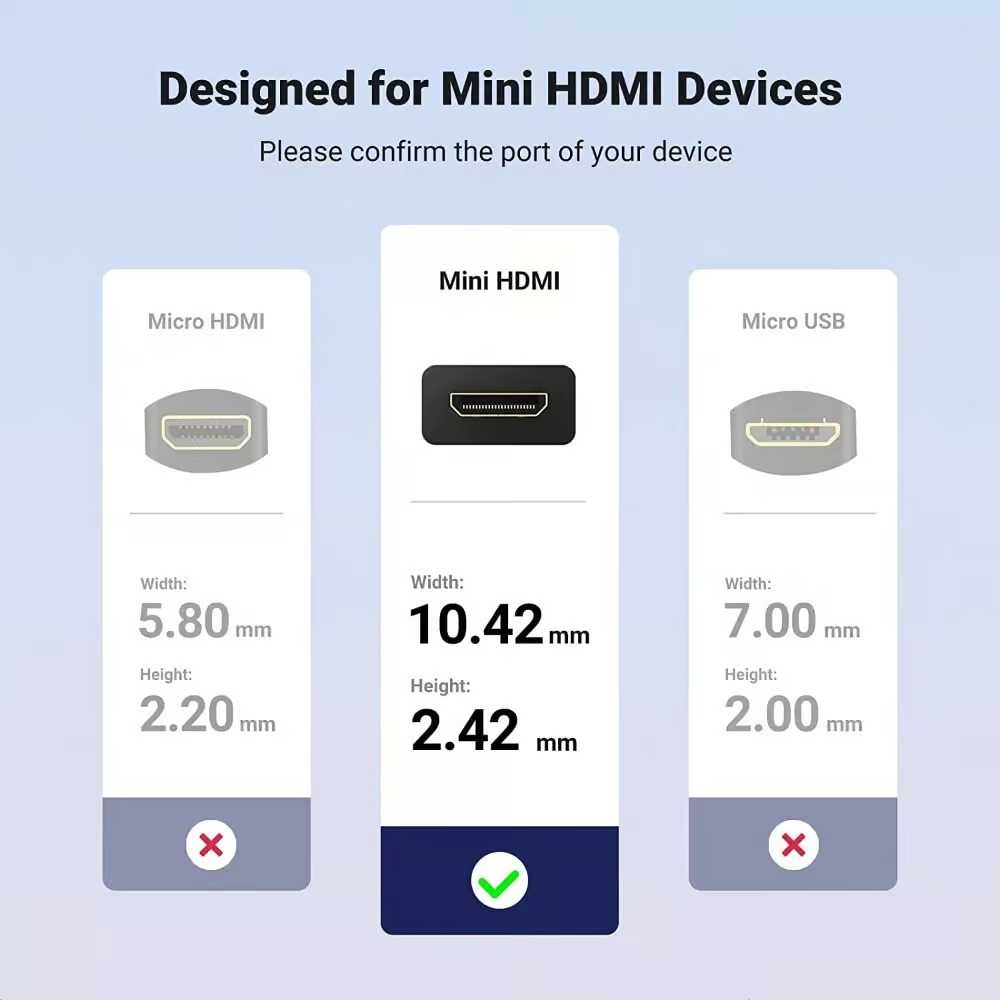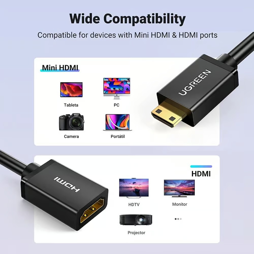 Convert Mini HDMI to HDMI : This Mini ugreen HDMI male to HDMI female cable is ideal for connecting a camcorder, camera, laptop, video card, or tablet with Mini HDMI port to HDMI compatible TV, HDTV, monitor, or projector. Enable you viewing hi-definition video or image at home, office, or conference room.