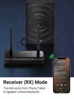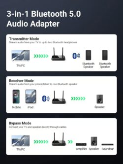 - 3-in-1 Functionality: Works as a Bluetooth transmitter (TX), receiver (RX), and bypass adapter for versatile audio connectivity.