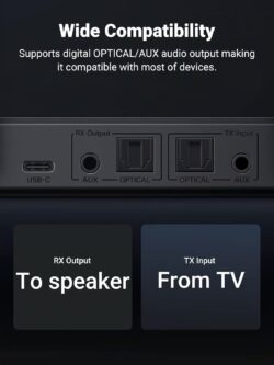 Compatible with a wide range of devices, including TVs, PCs, smartphones, tablets, Bluetooth headphones, and speakers, the UGREEN 20140 is perfect for enhancing your home entertainment system or creating a wireless audio setup. Its plug-and-play design with optical, USB, and AUX connectivity options ensures easy installation and use.