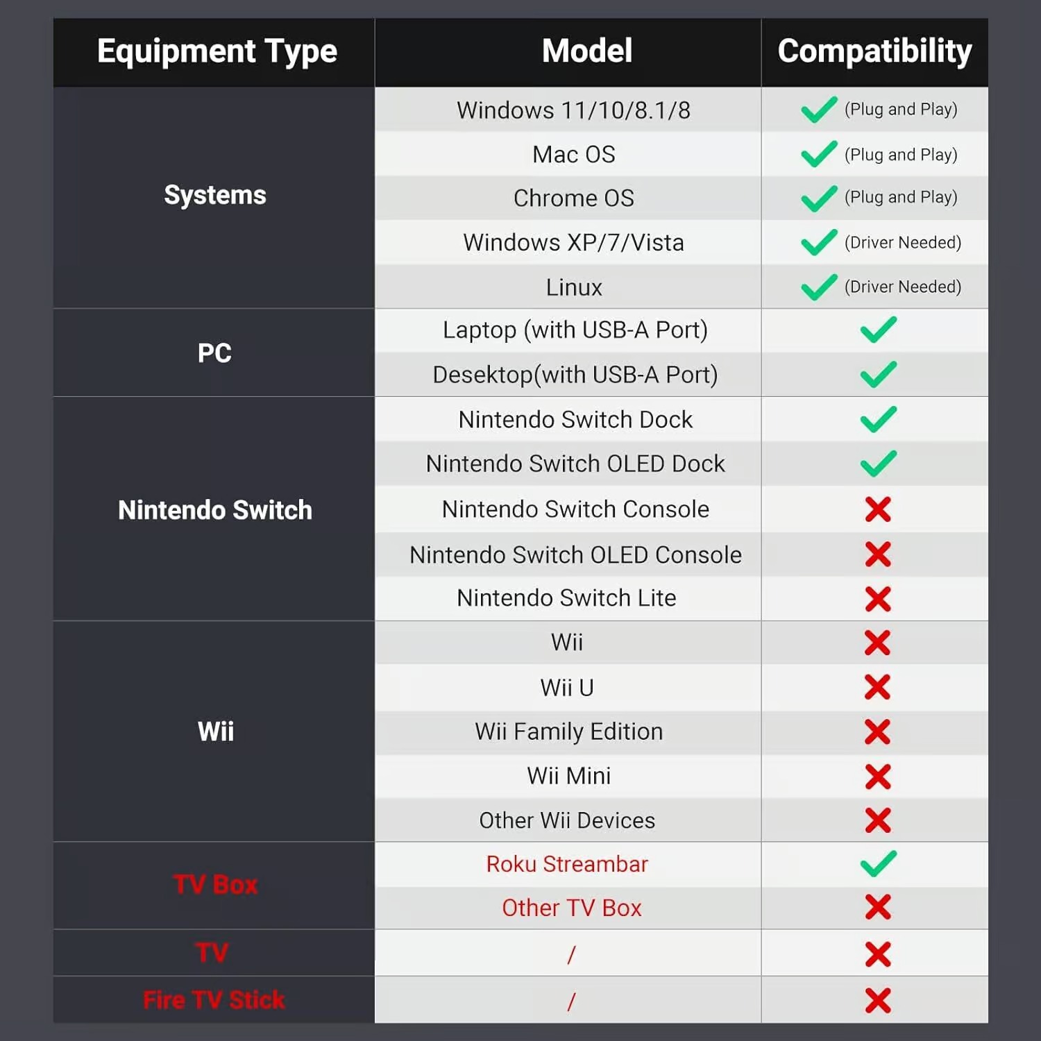 - Wide Compatibility: UGREEN usb network adapter is compatible with Nintendo Switch, Nintendo Switch Oled, Laptop, Desktop, Roku Streambar, and more USB-A devices. (Not compatible with Nintendo Switch Lite, Wii, Other TV Boxes, all TV and Fire TV Sticks.)
