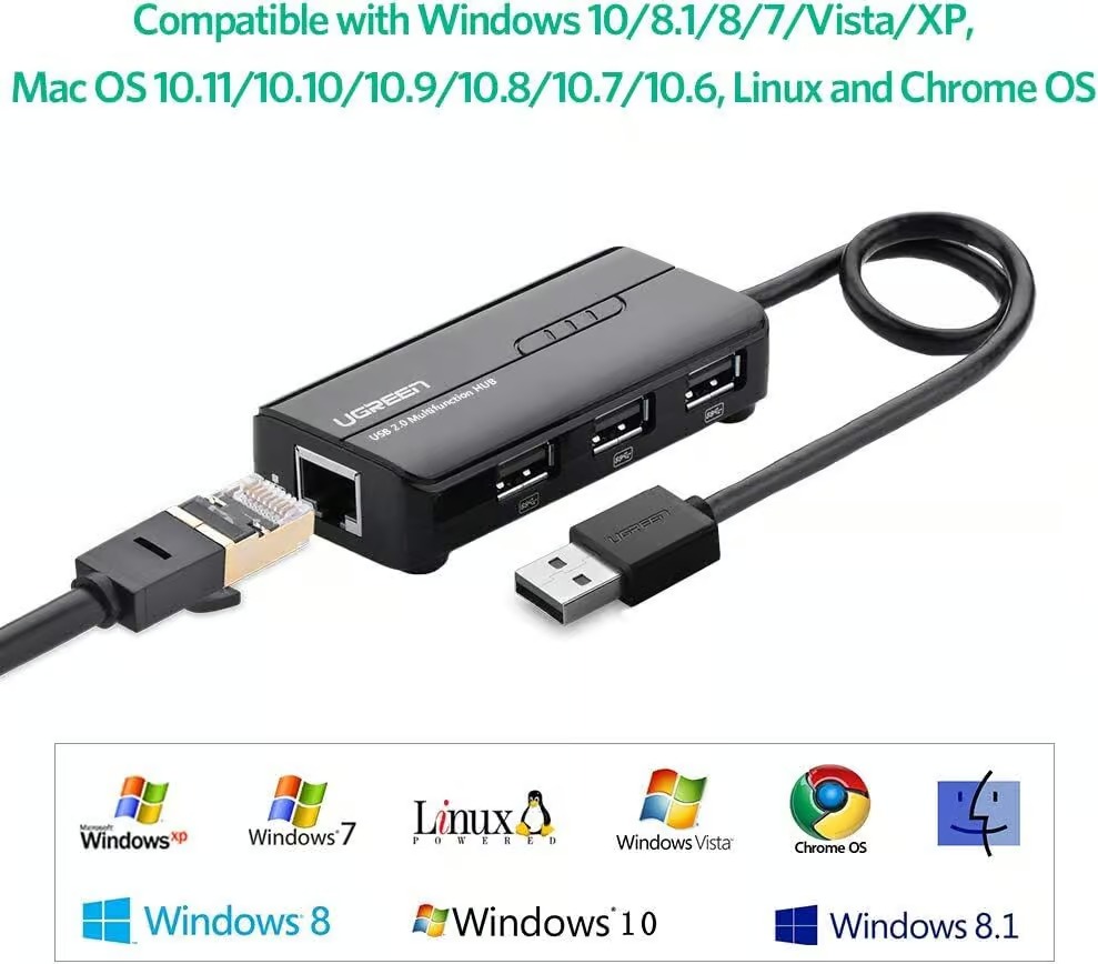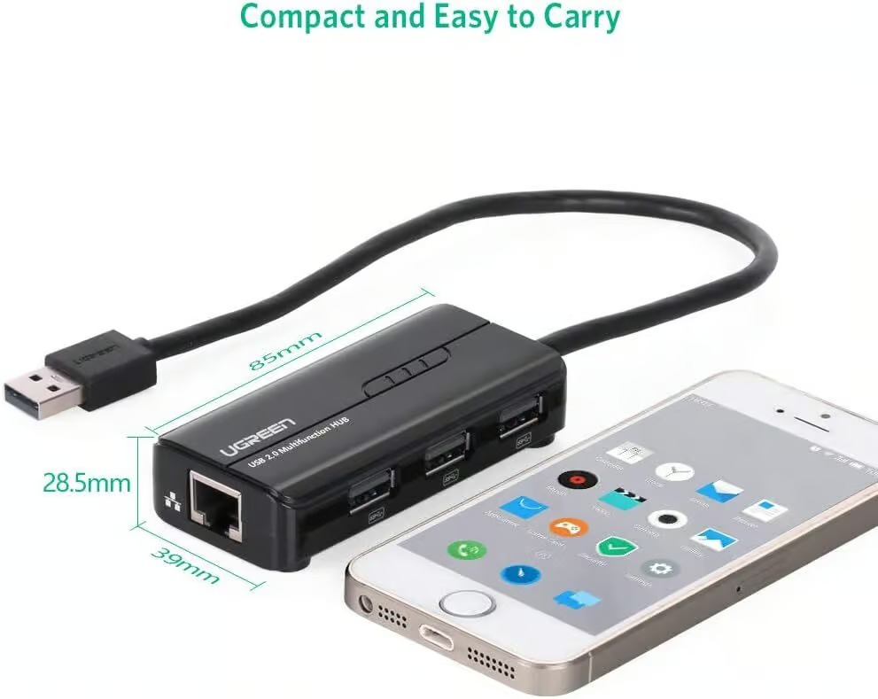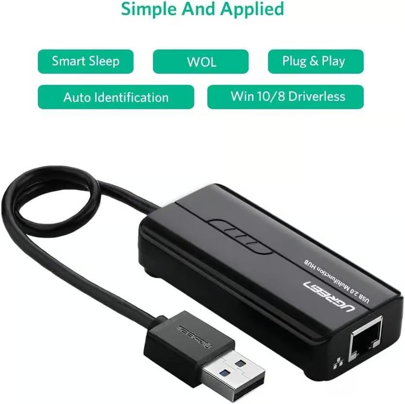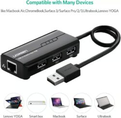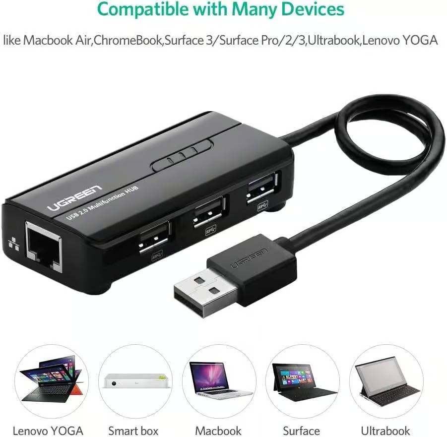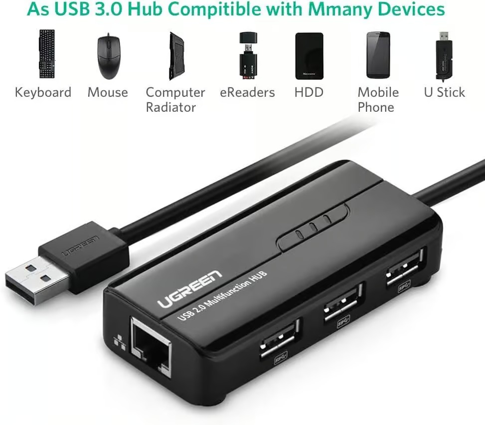 - Ugreen USB 2.0 Hub 3 Ports with 10/100Mbps Ethernet Network x1;
