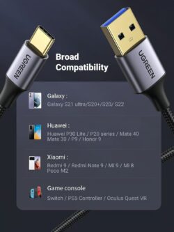 3A Fast Charging: Support QC / AFC / FCP and 18W max power delivery, this USB A to USB C cable charges your devices as fast as the original cable5Gbps Data Sync: With up to 5Gbps data transmission, 10 times faster than USB 2.0, this USB C Cable enables you to transfer HD movies in less than 3sWide Compatibility: This USB A to USB C cable is compatible with iPad Pro 2021, iPhone 15/Plus/Pro/Pro Max, Galaxy S23 Ultra, Mi 13, Redmi Note 12, Pixel 7, Huawei P60 Pro/Mate 60 Pro, Switch, etcSafer Charge: With a built-in 56KΩ resistor, UGREEN USB C lead provides a safer charging experience for you; In addition, the triple shields and tinned copper core provide reliable conductivity and stabilitySuperior Durability: Withstand 10000+ bends test, this Type C nylon-braided cable is more durable than regular cables