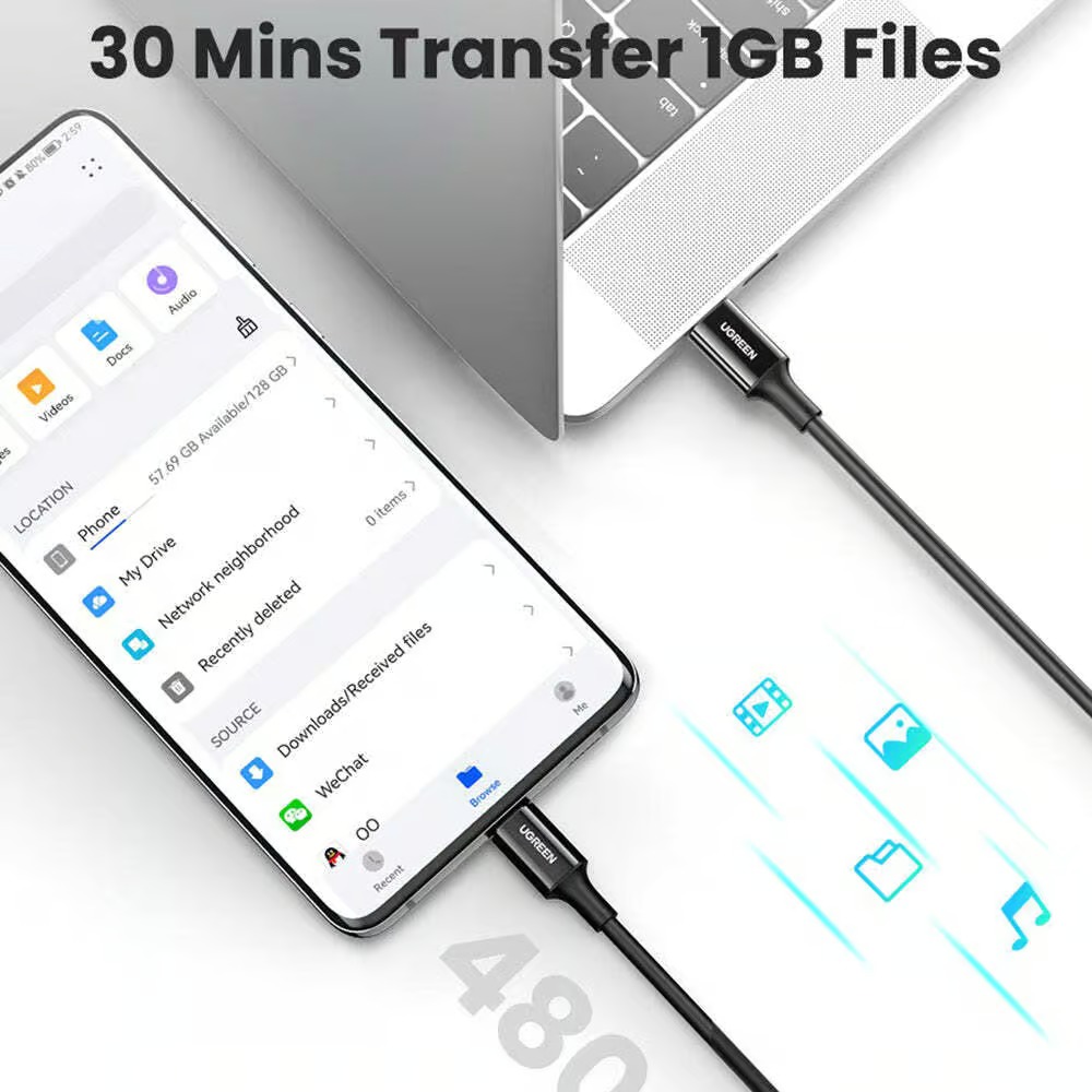 Beyond its charging prowess, the UGREEN 20528 cable excels in high-speed data transfer, reaching up to 480 Mbps between USB-C devices. Transferring large 1GB files becomes a breeze, taking only 30 seconds to complete. Whether you’re backing up important data or transferring multimedia content, this cable ensures a seamless and rapid data exchange experience.