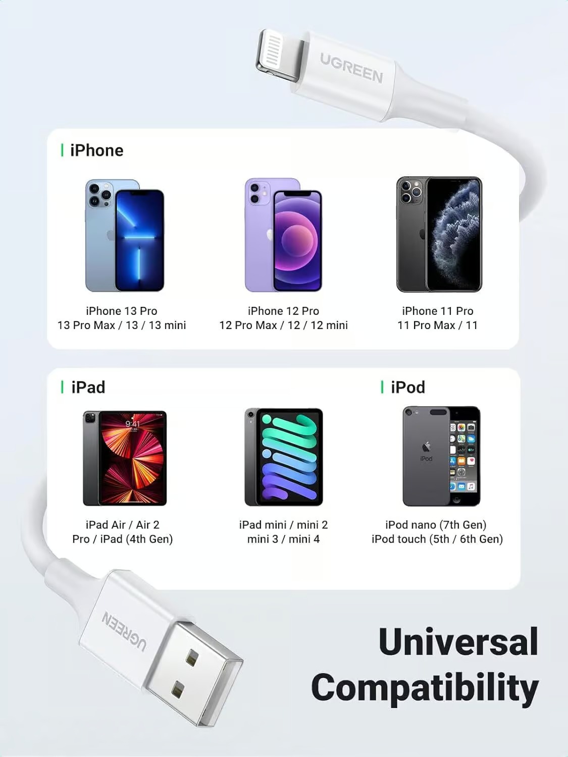 - Authorized by Apple: Featuring original connector and MFI certified chip, UGREEN USB lightning cable builds a double protection for your iPhone or iPad. No warning message pos up to disturb you,Plug then go work, totally worry-free.