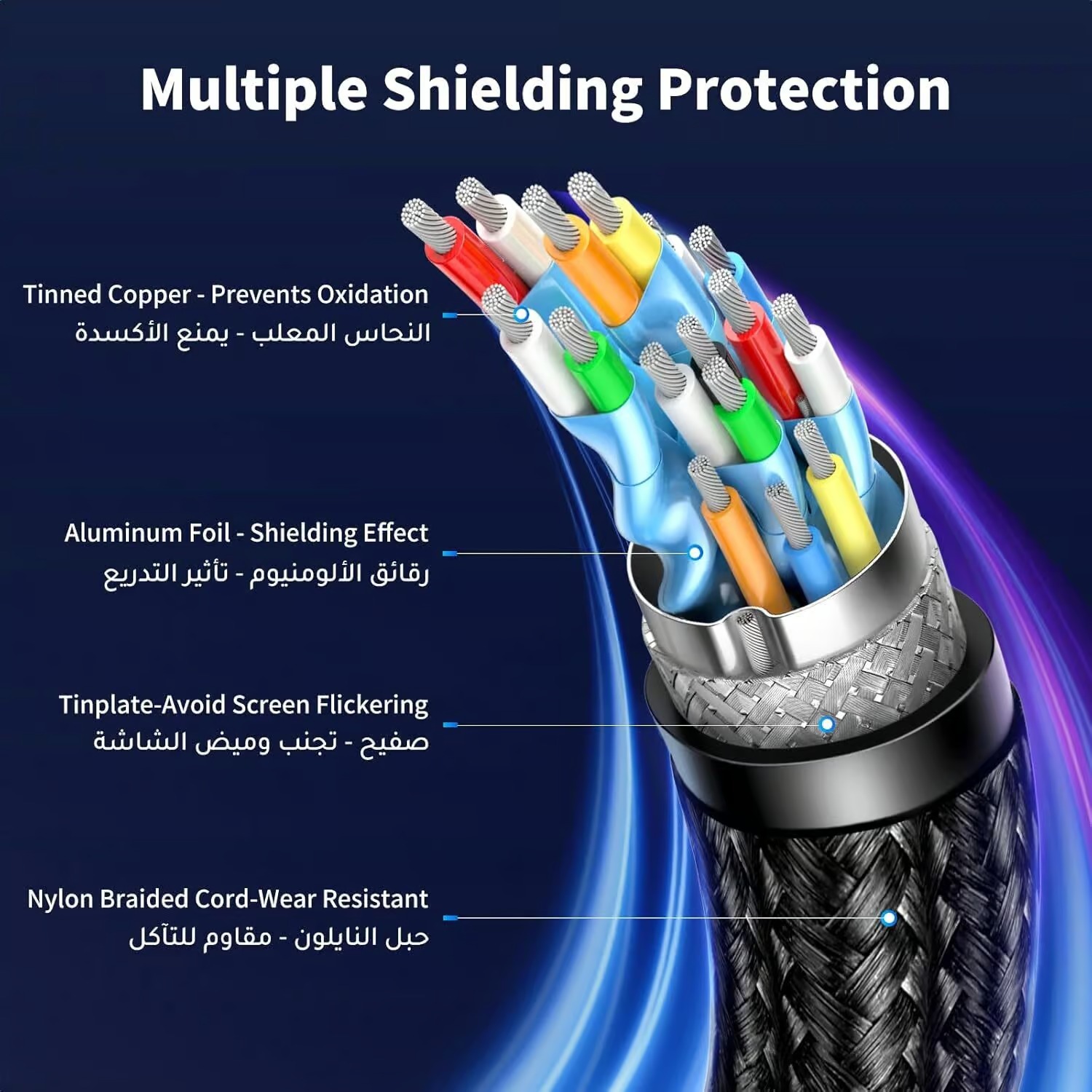The aluminum braided cable features multi-layer shielding (tin-plated copper, aluminum foil, and mesh) to block interference, ensuring stable 4K/8K video and audio transmission. With FreeSync, G-Sync, and HDR support, it eliminates screen tearing and ghosting for competitive gaming. The gold-plated connectors and 10,000+ bend lifespan make it a reliable choice for long-term use.