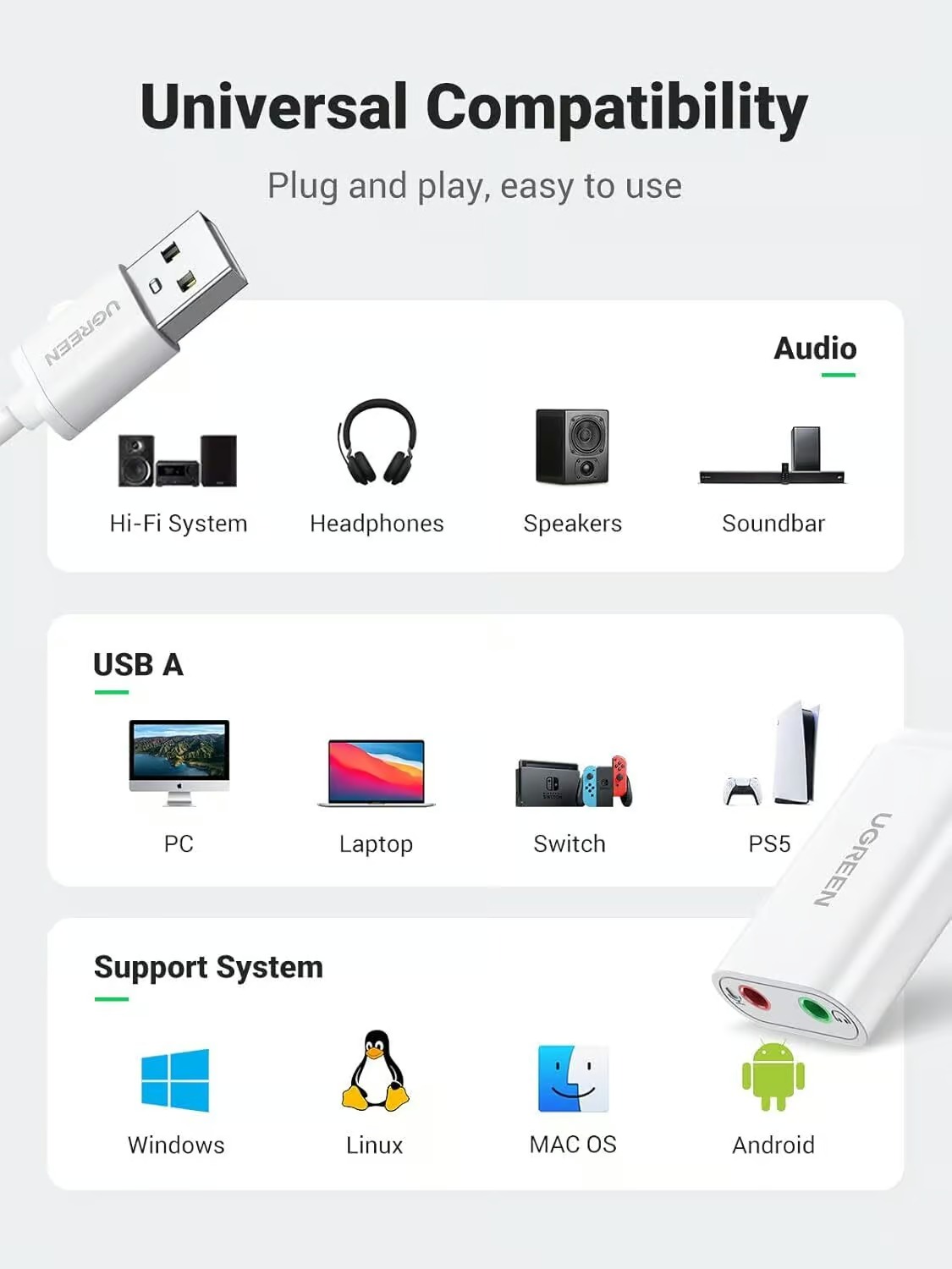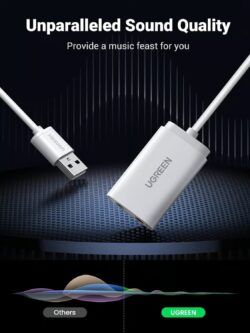 UGREEN USB Audio Adapter External Stereo Sound Card with 3.5mm Headphone and Microphone Jack for Windows, Mac, Linux, PC, Laptops, Desktops, PS4 (White)