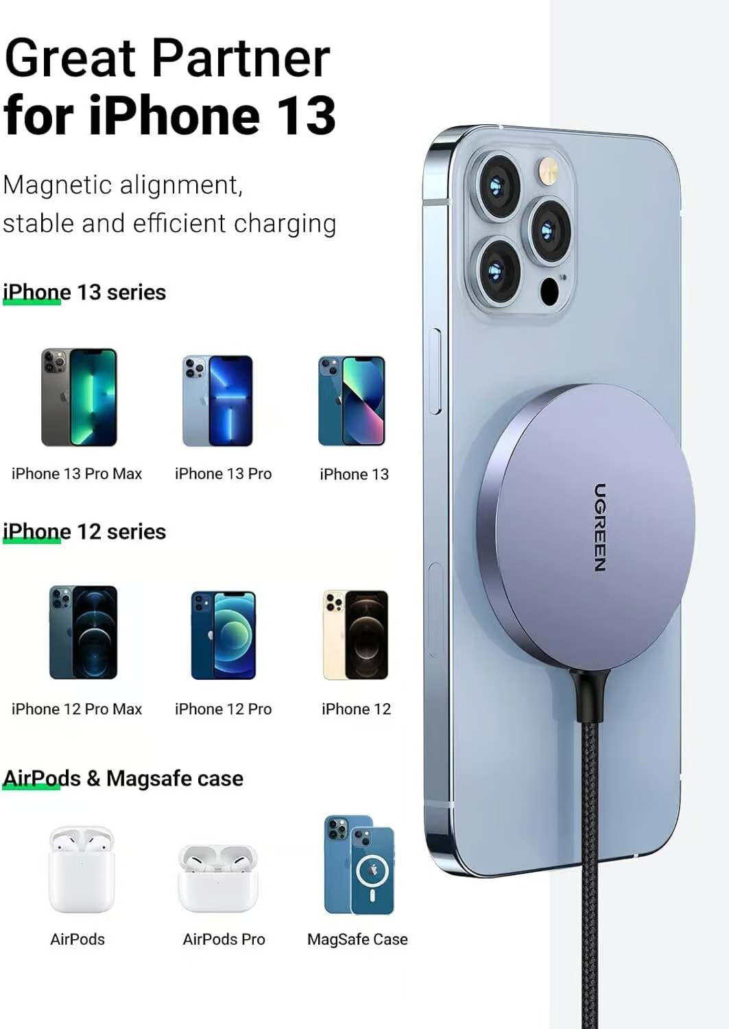 • Provide a 7.5W charging for the iPhone 12/13 series. To charge the iPhone series at 15W, please use its official MagSafe wireless charger.