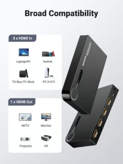This versatile HDMI Switch 3 in 1 out is compatible with a wide range of HDMI source devices, including Apple TV, Roku, Stick/Fire Stick, PS5/PS4/PS3, Xbox, Xbox 360, Nintendo Switch, Laptop/PC, Blu-ray and DVD players, and more. It’s designed to meet your diverse entertainment needs.