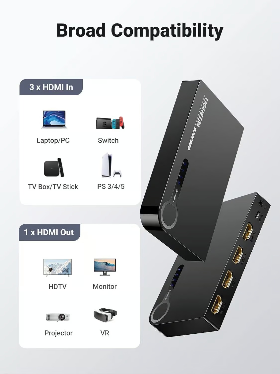 Upgrade your home entertainment setup with the UGREEN 3-Port HDMI Switch. Enjoy seamless connectivity, stunning 4K resolution, and the convenience of remote control, all in one compact package. Elevate your multimedia experience today!