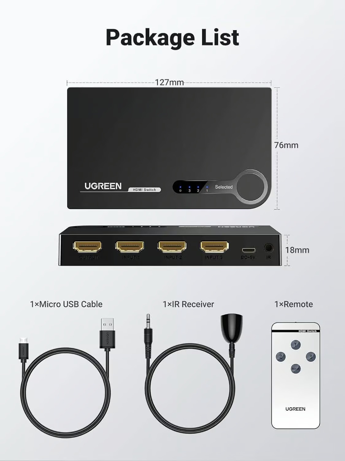 Package Contents: 1 x HDMI Switch 1 x Remote Control 1 x Infrared Control Cable 1 x Charging Cable 1 x User Manual