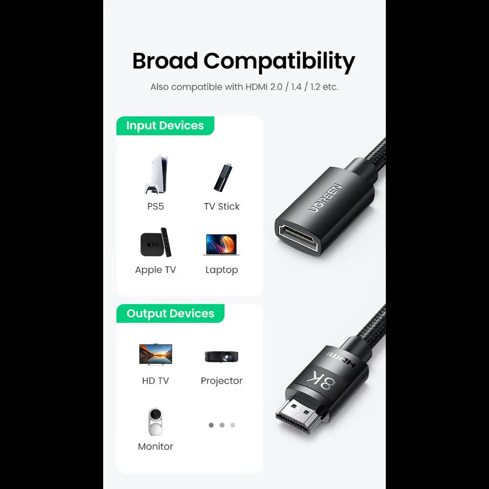 Ugreen HDMI 2.1 cable supports 8K,3D presentation formats with 21:9 aspect ratio and 32 audio channels and works with frequencies up to 1536 kHz, wide bandwidth helps data transmission speed up to 48Gbps, allowing you to connect your TV, HD/4K projector to your Blue-Ray/DVD player, Xbox, Play Station, PC and other HDMI output devices.