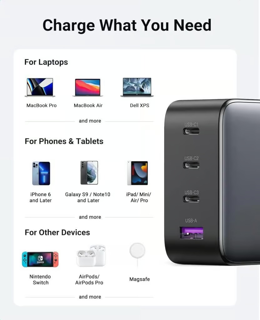 • 4 In 1 Multiport charger: 3 USB C portas and 1 USB A port provide 100W to phones, tablets, laptops, and more, all at the same time fast charging