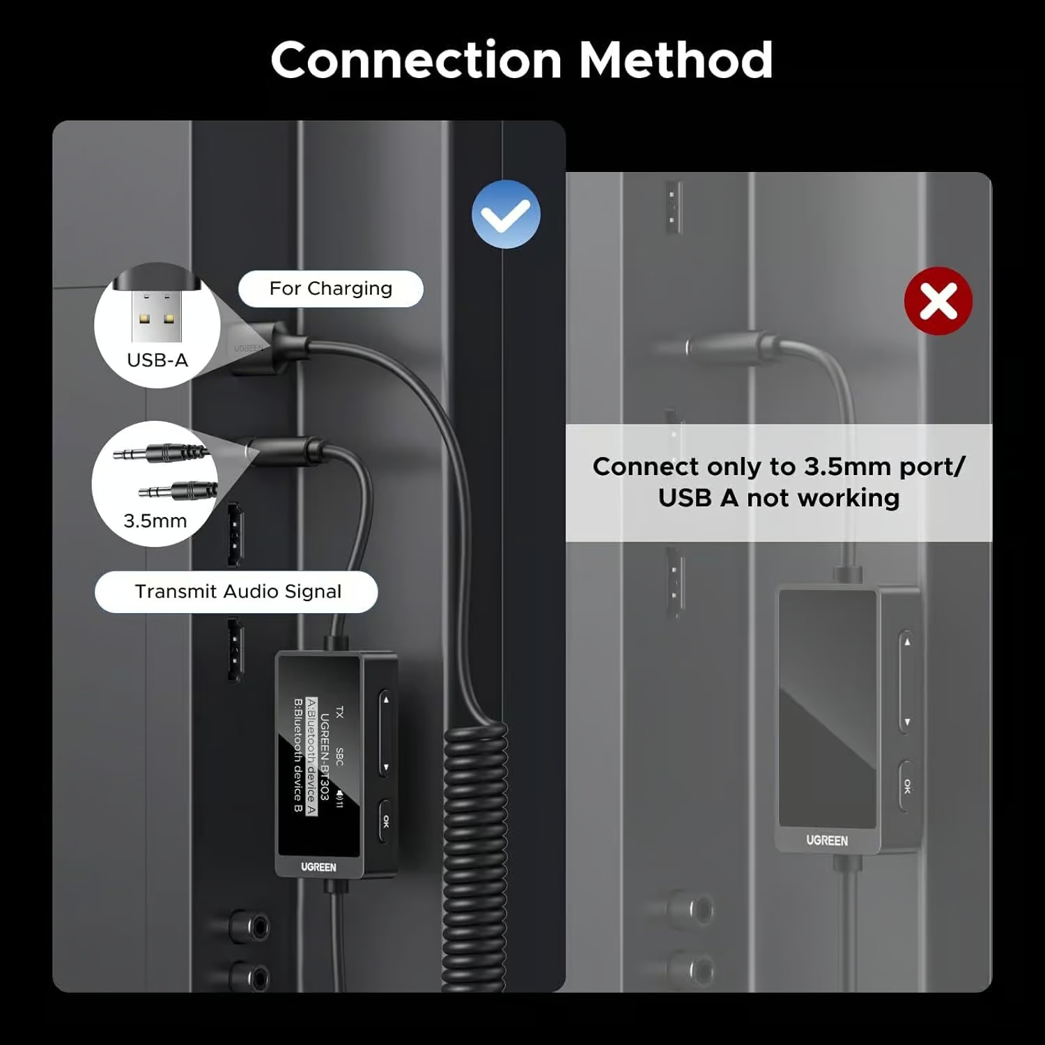 UGREEN 45236 Bluetooth 5.4 Transmitter Receiver, Dual Pairs 3.5mm Audio Aux Adapter with Built-in Microphone for Hands-Free Calls, 2-in-1 Wireless Bluetooth Adapter Compatible with Car Speakers Home Stereo (Model BT303)