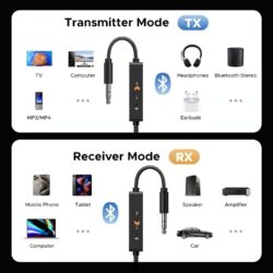 - 2 In 1 Bluetooth Transmitter Receiver: In TX mode, connect to devices like airplanes, TVs, and more without Bluetooth, then connect Bluetooth headphones to listen to music. In RX mode, turn non-Bluetooth devices like car audio or old speakers into Bluetooth-enabled ones, and then play music from phones, computers, and more. Enjoy cable-free freedom via Bluetooth Transmitter Receiver, anywhere, anytime.