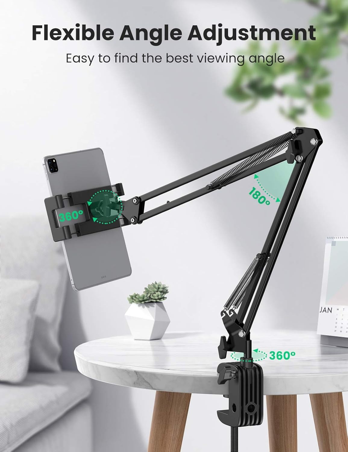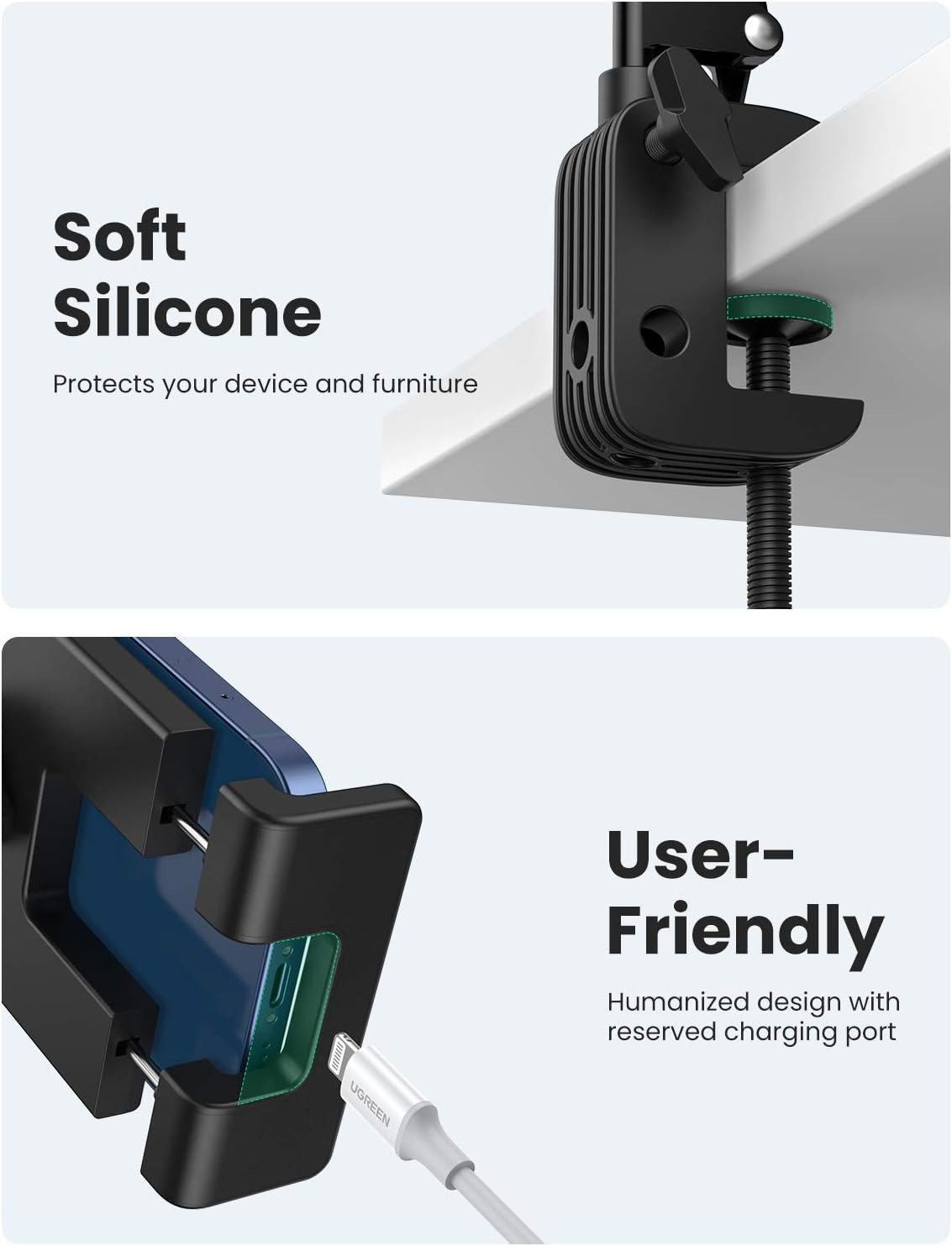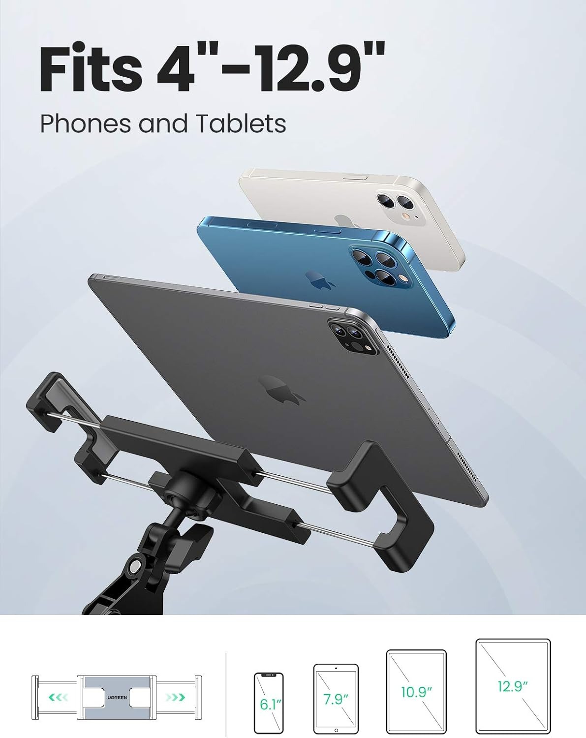 UGREEN 50394 Adjustable Tablet Stand – Long Arm Flexible Holder for iPad Pro/Air/Mini, iPhone, Nintendo Switch (360° Rotation, Bed/Desk Clamp, Black)