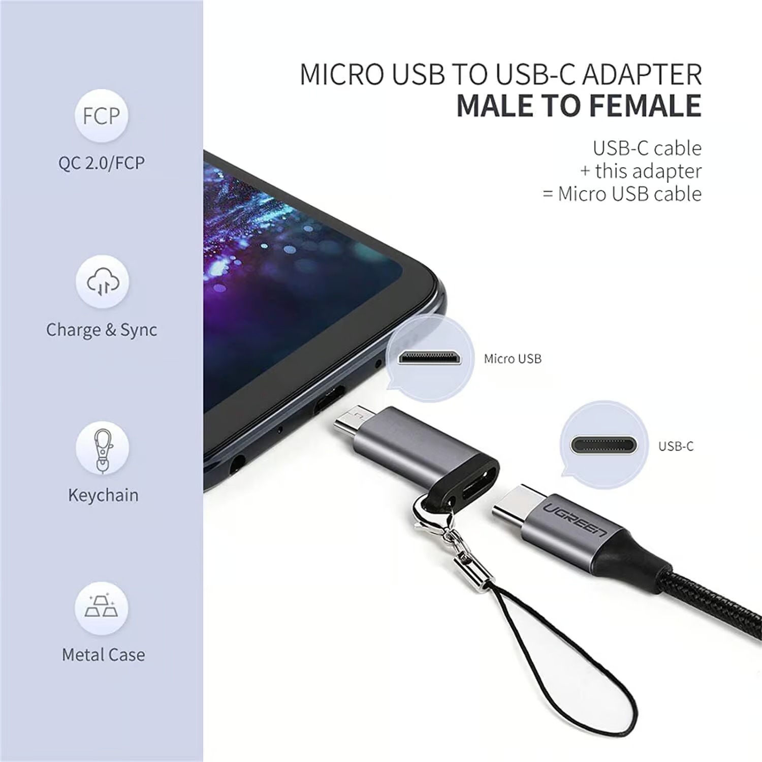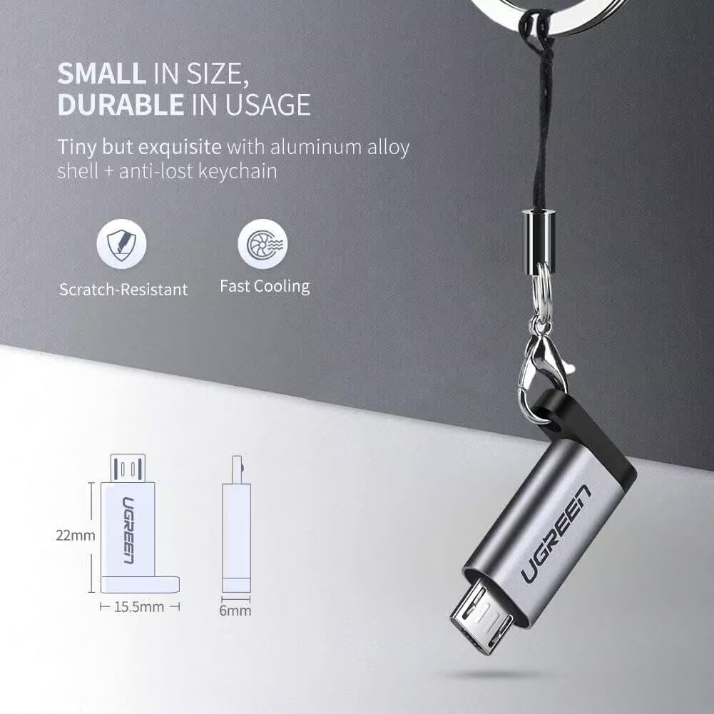 UGREEN 50590 USB-C Female to Micro USB Male Adapter, 2.4A Fast Charging, 480Mbps Data Transfer, Compatible with Smartphones & Tablets – Durable Aluminum Case, Easy to Carry with Keychain Strap – Grey