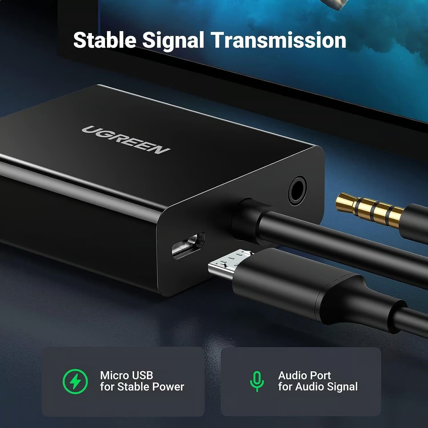 The UGREEN 60814 supports audio output through 3.5 Audio or 3.5 TO R + L, enhancing the overall multimedia experience. Additionally, a Micro USB port is available for users seeking additional power supply, ensuring optimal performance.