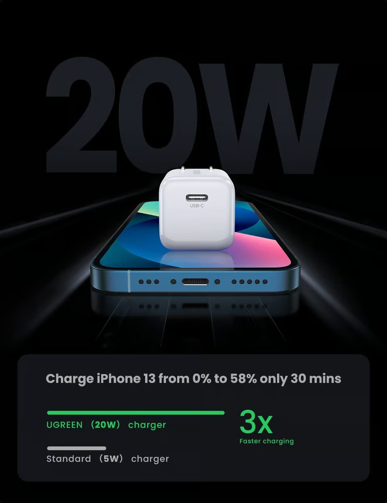 UGREEN 20W PD USB C Charger — Smaller Yet 3X Faster to charge your iPhone 13 from 0% to 58% within 30mins