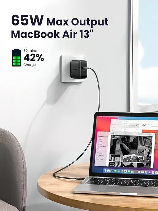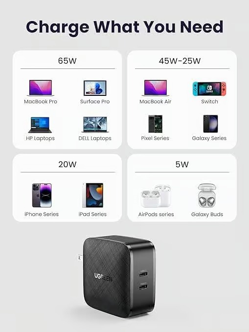 UGREEN 70866 – 66w USB C Charger, 2 Ports Foldable Wall Charger, PD 65W Charger Power Adapter Compatible with MacBook, Dell/HP Laptops, iPad, iPhone 14, iPhone 5, Galaxy S22/S21, Steam Deck, ROG Ally and More