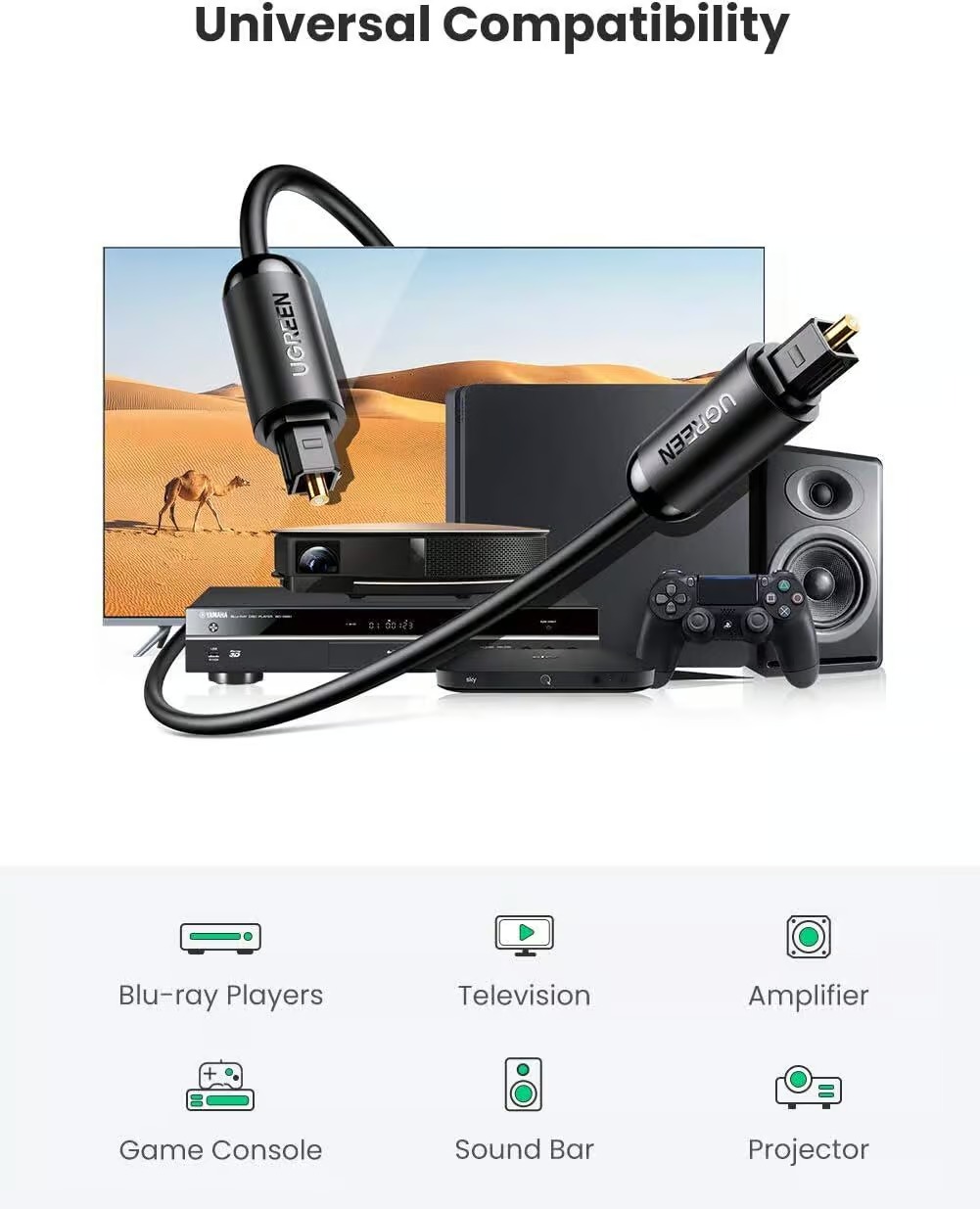 This UGREEN Toslink Optical Audio Cable opens doors to a wide spectrum of compatible devices, including LG, Samsung, Sony, Panasonic TVs, Soundbars, amplifiers, speakers, audio processors, and DACs, ensuring connectivity that goes beyond mere functionality.