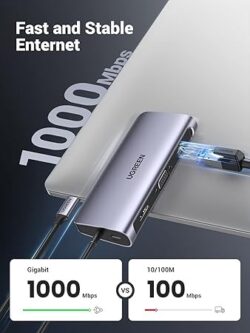 100W power delivery charging port allows you to charge your computer, MacBook Pro or other Type-C devices while transferring data. USB C to RJ45 1000M Ethernet Port backwards compatible with 100Mbps/10Mbps RJ45 LAN. Gigabit Ethernet port ensures a more stable and faster wired network connection