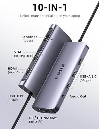 UGREEN 80133 USB C Hub, 10-in-1 USB-C Docking Station, 4K HDMI& VGA Dual Monitor, 1Gbps Ethernet, 100W PD, 3 3.0 Ports, 3.5mm Audio Jack, SD/TF Card Reader Multiport