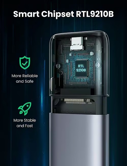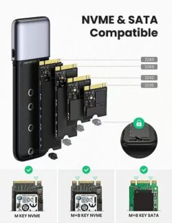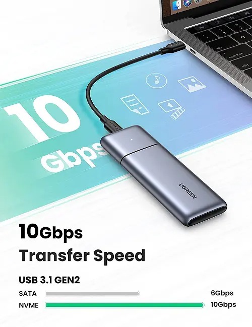 UGREEN USB C ssd enclosure supports up to 10Gbps transfer speed, 16Gbps PCIe 3.0 and 6Gbps M.2 SATA 3.0 while you connect NMVe SSDs or M.2 SATA SSDs.
