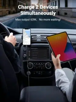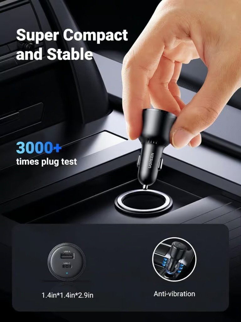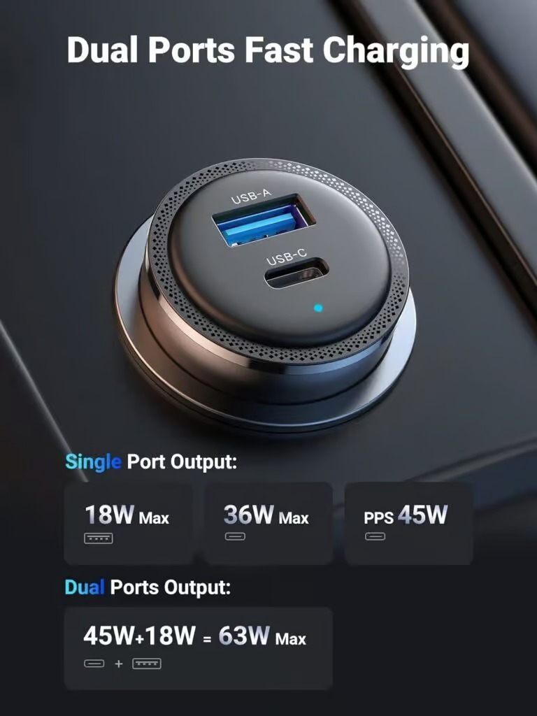 - 63W Simultaneous High-Speed Charging: Equipped with 45W PD3.0 PPS USB-C port and 18W QC3.0 USB-A port, this Car Charger Adapter can fast charge 2 devices simultaneously with a total output of 63W, which is perfect for family travel.