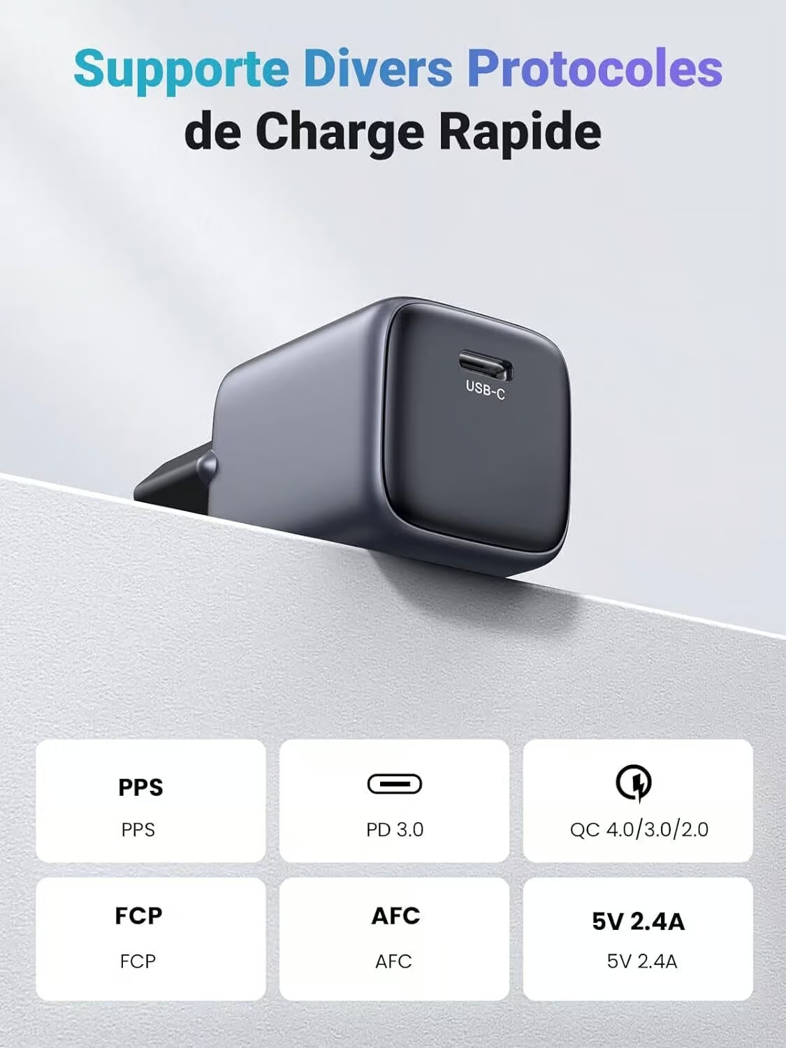 The 20W USB C GaN charger boasts extensive protocol support, including PD 3.0/2.0, QC 4.0/3.0/2.0, PPS, and BC 1.2. This versatility ensures high-speed charging for a wide range of devices, making it a versatile and indispensable accessory for tech enthusiasts.