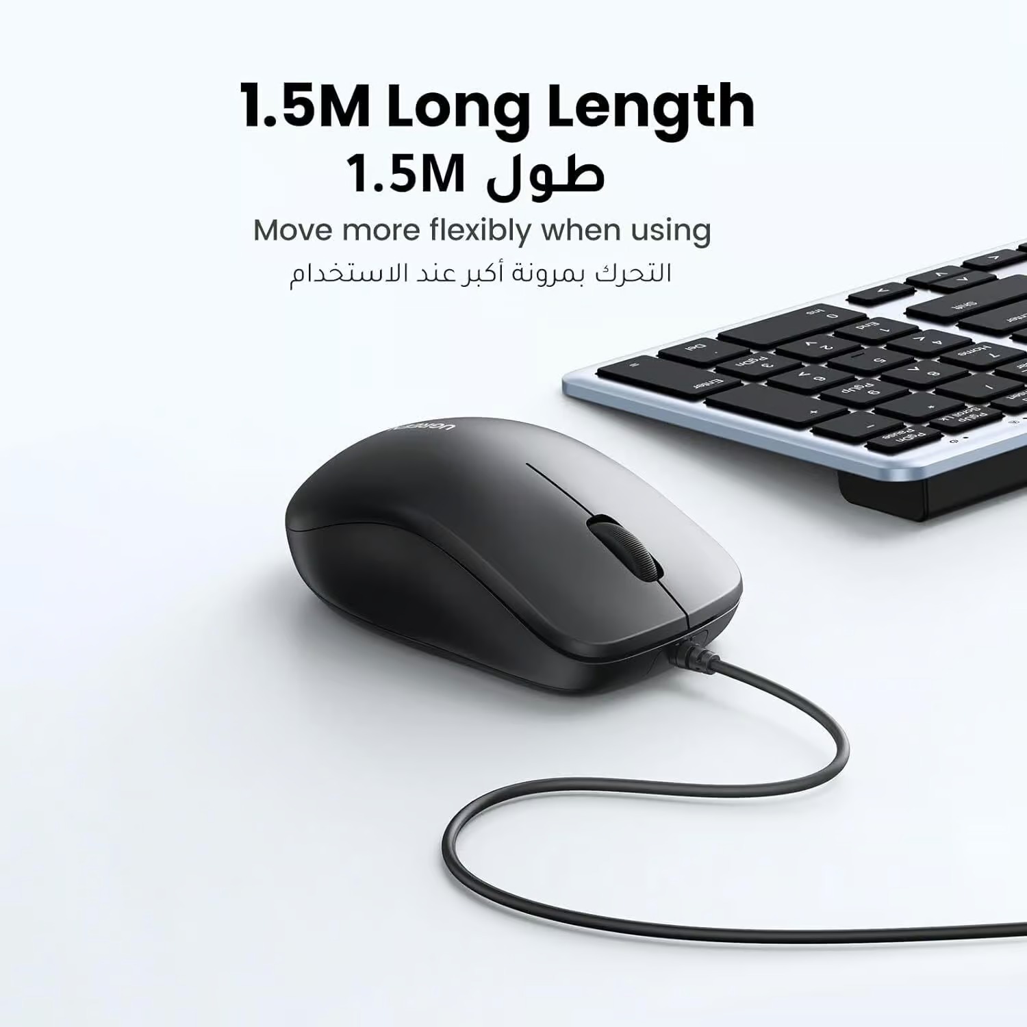 A1: The USB cable for the UGREEN 90789 Wired Mouse is 1.5 meters long, providing ample reach and flexibility for your computing needs.