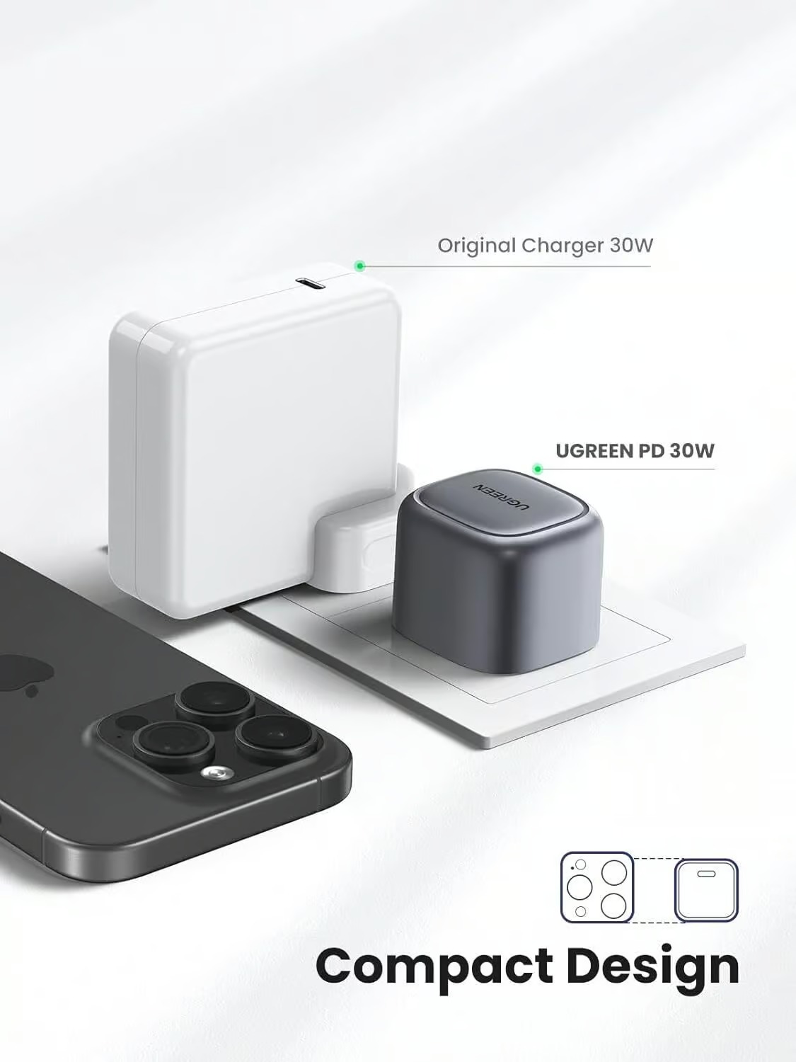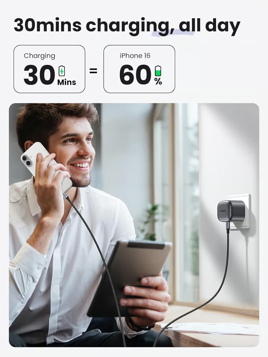 The UGREEN 90878 USB-C Charger Nexode 30W is a compact and powerful charging solution designed to keep your devices powered up quickly and efficiently. With 30W max output, this charger delivers fast charging for a wide range of devices, including the iPhone 15 series (up to 3x faster than the original 5W charger) and the iPad Pro 12.9 inches (2020) (fully charged in just 139 minutes).